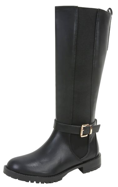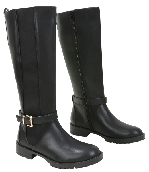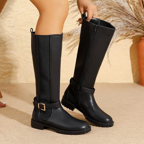 - Berness Women Knee High Boots Buckle Strap Riding Elastic Sides Zippers Flat Block Heel PAMA