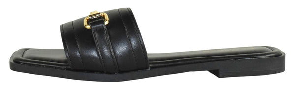 Step into comfort and style with the KAMARI Berness slide sandals. These lightweight flat slides feature a modern square open toe, cushioned footbed for all-day support, and elegant gold chain hardware that adds a touch of sophistication. The faux leather construction keeps them easy to clean and maintain, while the minimal 0.5" heel ensures effortless wear from morning to night. Whether you're dressing up or keeping it casual, these versatile summer slides deliver both comfort and polish. True to size.