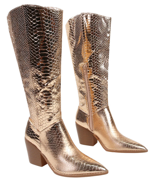 Step into the spotlight with LILIBETH, where Western swagger meets modern edge. These knee-high cowboy boots feature a striking snakeskin print texture that demands attention, paired with a sturdy block heel for all-day comfort and confidence. Side zippers make getting dressed effortless, while the sleek finish works with everything from denim to dresses. Whether you're channeling your inner cowgirl or just want to add some attitude to your wardrobe, these boots deliver serious style with zero fuss.