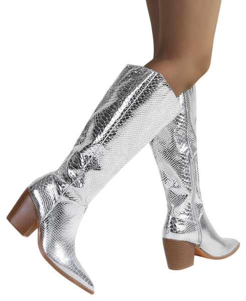- Berness Women Knee High Western Cowboy Boots Side Zippers Block High Heel Pointed Toe Snakeskin Print LILIBETH