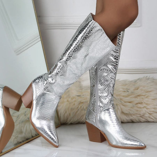 Step into the spotlight with LILIBETH, where Western swagger meets modern edge. These knee-high cowboy boots feature a striking snakeskin print texture that demands attention, paired with a sturdy block heel for all-day comfort and confidence. Side zippers make getting dressed effortless, while the sleek finish works with everything from denim to dresses. Whether you're channeling your inner cowgirl or just want to add some attitude to your wardrobe, these boots deliver serious style with zero fuss.
