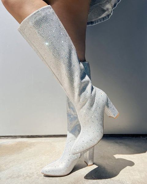 • TOP MODA Women Knee High Rhinestone Studded Bling Boots Side Zippers Block High Heel Pointed Toe Sparkly MARTHA-22