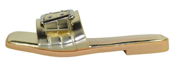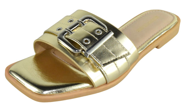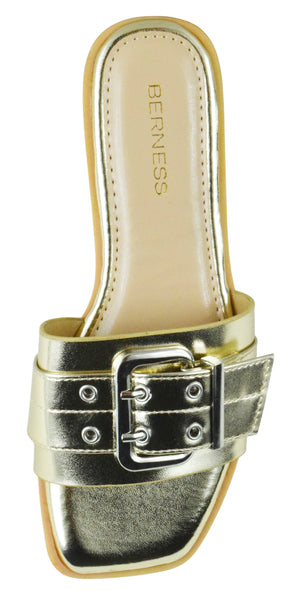 - Berness Women’s Slide Sandals – Metal Eyelet Buckle Strap, Cushioned Footbed, Lightweight Slip-On Flat Sandals TRACE
