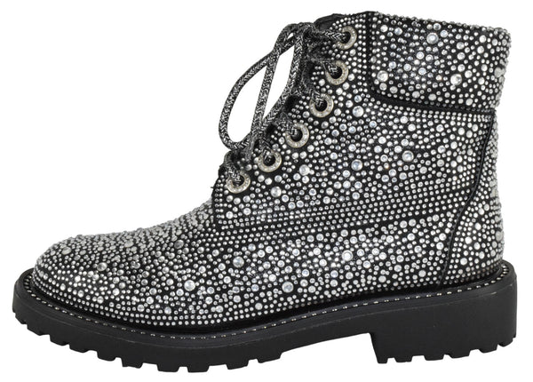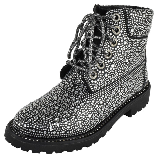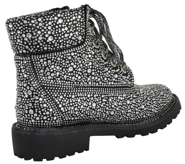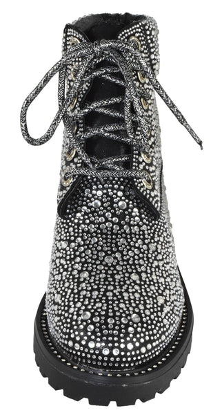 Forever Women Rhinestone Studded Bling Ankle Combat Boots Round Toe Sparkly Fashion Party Booties Lace Up WONDERFUL-8 Black