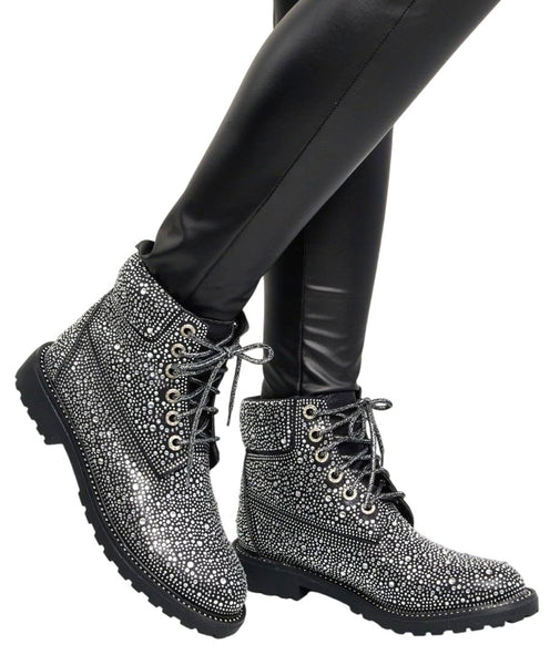 Step into the spotlight with these dazzling rhinestone-studded ankle combat boots that turn heads wherever you go. Featuring a round toe silhouette and eye-catching sparkly embellishments, they're the perfect blend of edgy and glamorous. The lace-up design offers a secure fit while the sleek finish keeps them versatile enough for any occasion—from night-out parties to fashion-forward everyday wear. These booties deliver serious style with a fun, confident attitude that says you're ready to shine.